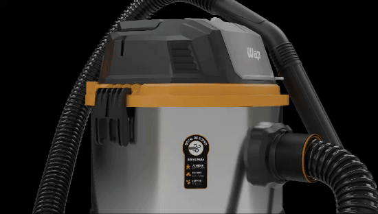 Para uma limpeza prática e organizada, o aspirador de água e pó da WAP conta com um porta acessórios que mantém o cabo elétrico de 3,6m e a mangueira de 1,7m armazenados de forma segura.